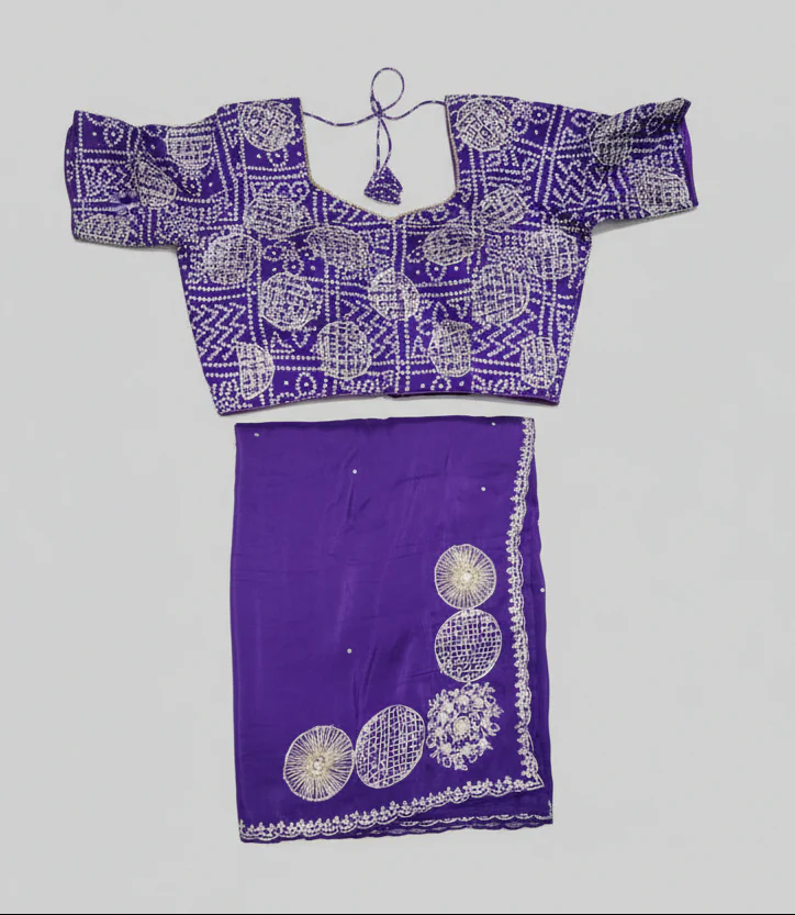 Color & Fabric: The saree is crafted in a rich, vibrant crimson red an purple with a luxurious satin silk finish, giving it a soft, fluid drape and a subtle natural sheen.